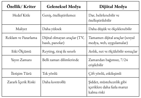 Tablo 1: Geleneksel Medya ve Dijital Medya Özellik Karşılaştırma Tablosu